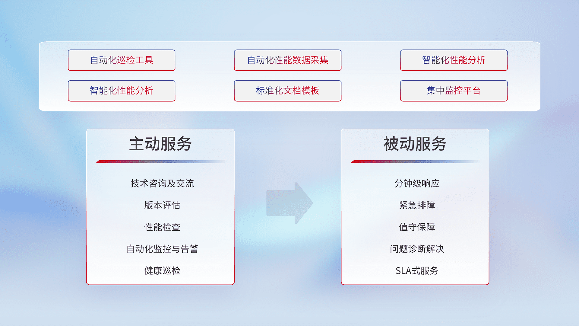 智能化工具和标准化文档,,,保障服务质量,,,,提供主动服务(包含技术咨询、、版本评估、、、性能检查、、自动化监控与告警、、健康巡检)和被动服务包含(分钟级响应、、紧急排障、、值守保障、、、、问题诊断解决、、、、SLA服务)。。。